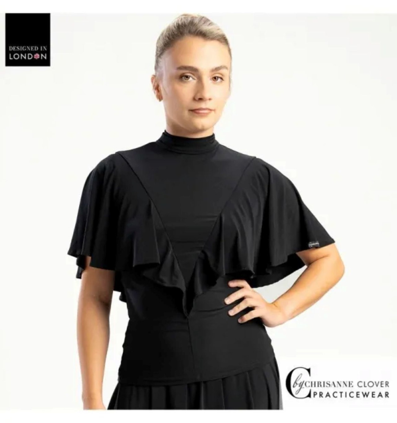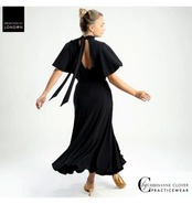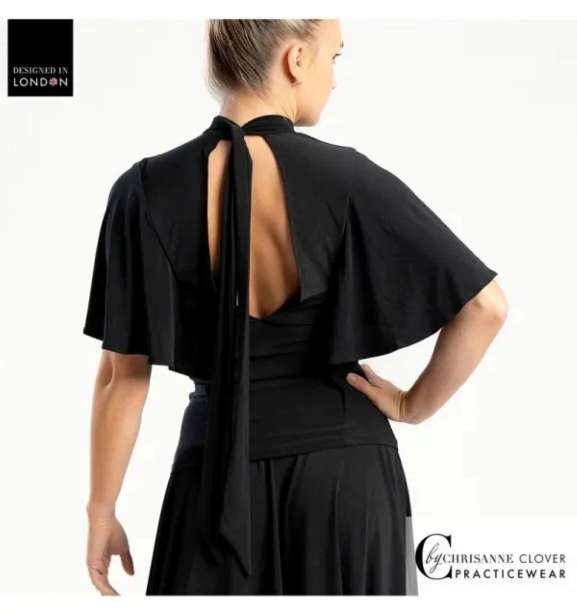 腕を優しく包むフレアケープと背中を伝うタイが、踊ると優雅に舞います。