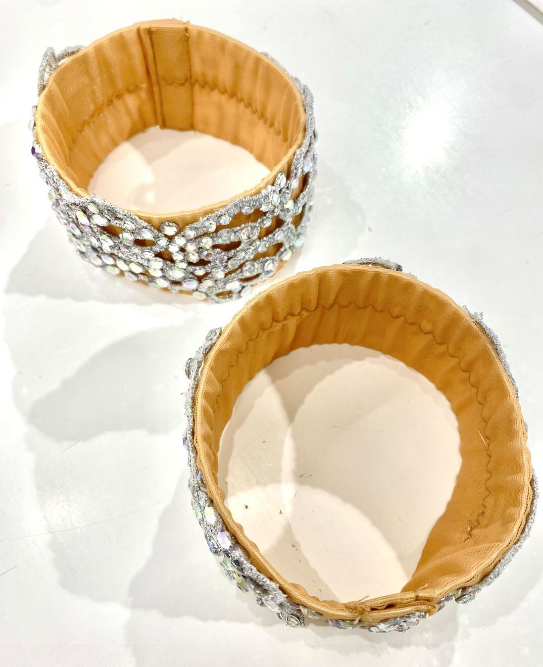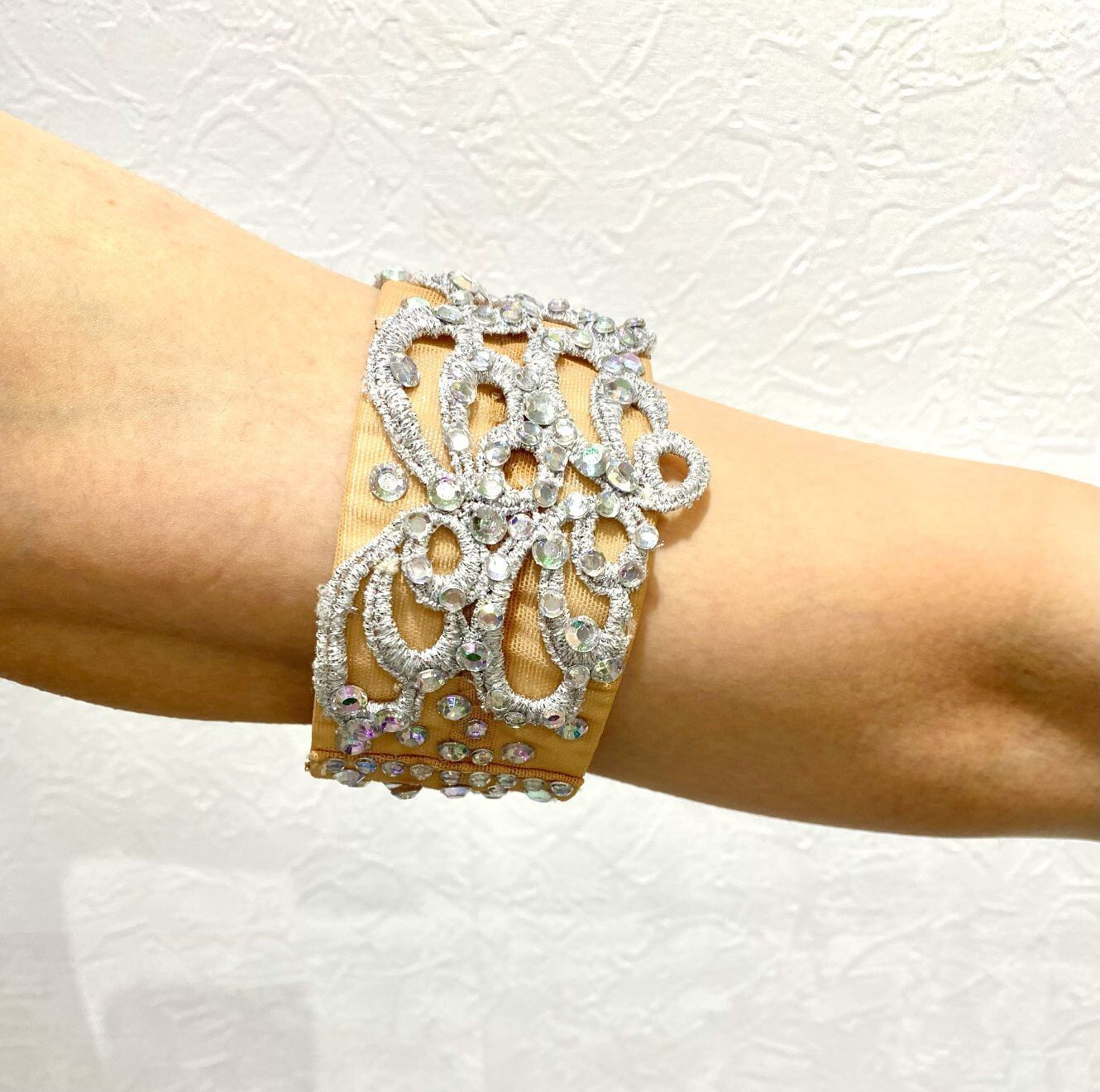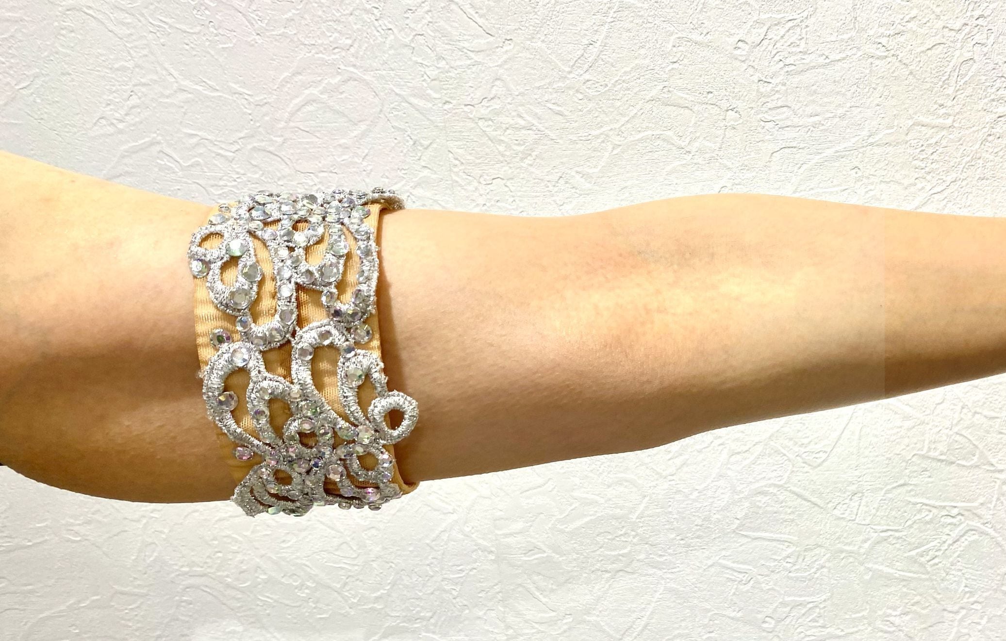 アールデコ調の美しいモチーフに、スワロフスキーをあしらった世界に1点のバングル♪ 太さが5㎝あり、ヌードカラーのメッシュ仕立て。 どんなドレスにも映えます!