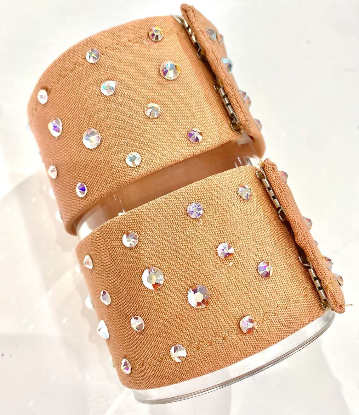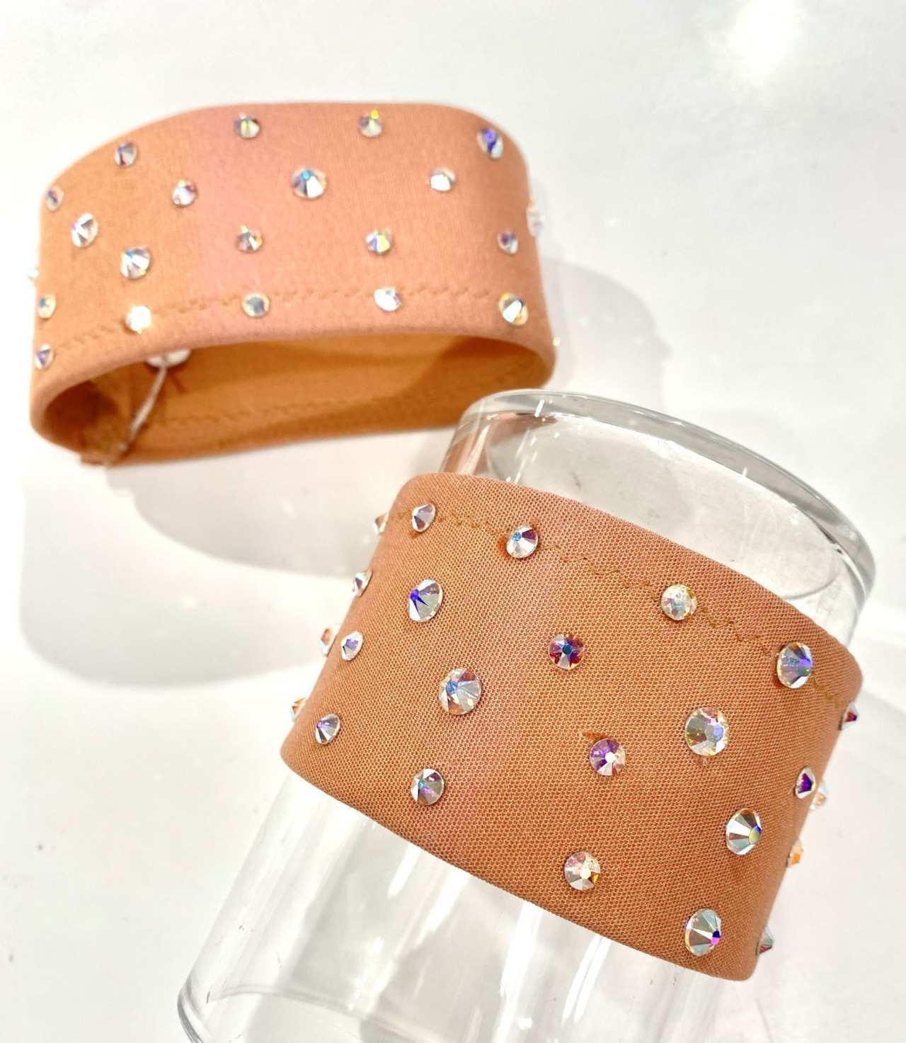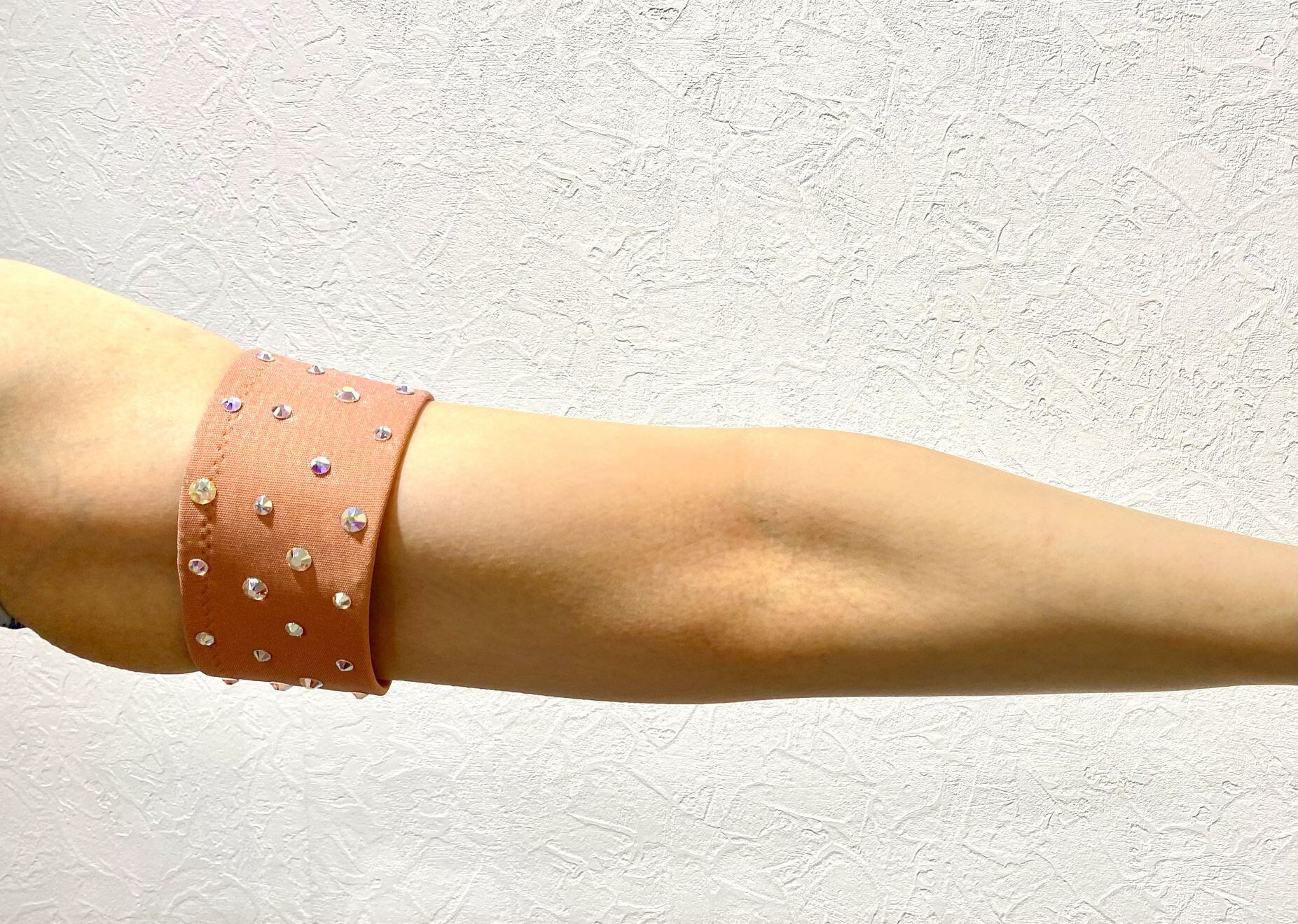 シンプルなメッシュ素材のヌードカラーに、異なる大きさのオーロラスワロフスキーをあしらった世界に1点のバングル♪ 気になる二の腕をカバーするだけではなく、煌めくスワロの輝きはシンプルながらもドレスを選ばず使用できる、持ってて価値ありの一品です!
