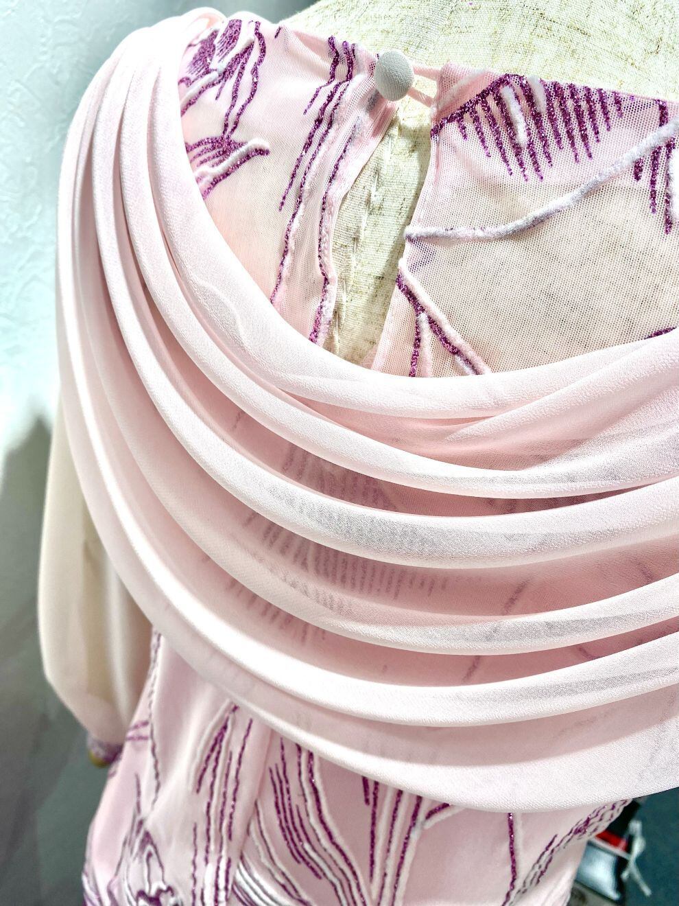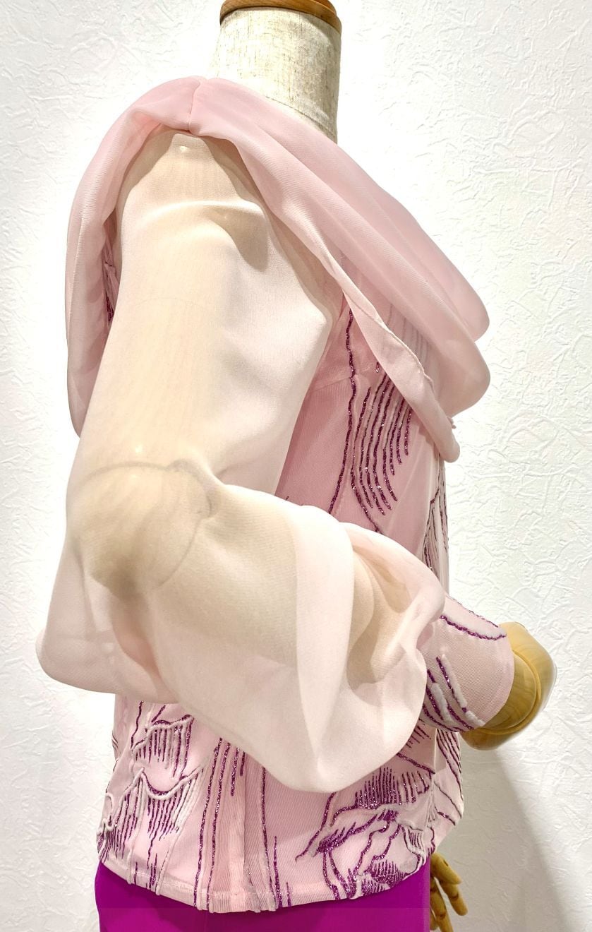 ペールピンクのオーガンジーに、チェリーピンクのラメ糸とホワイトのフロッキープリントで、印象派の絵画を思わせる優美なデザイン生地を使用。前後に美しいドレープ襟を施し、動きに合わせて空気をふくみ、美しくたなびくシルエットです。