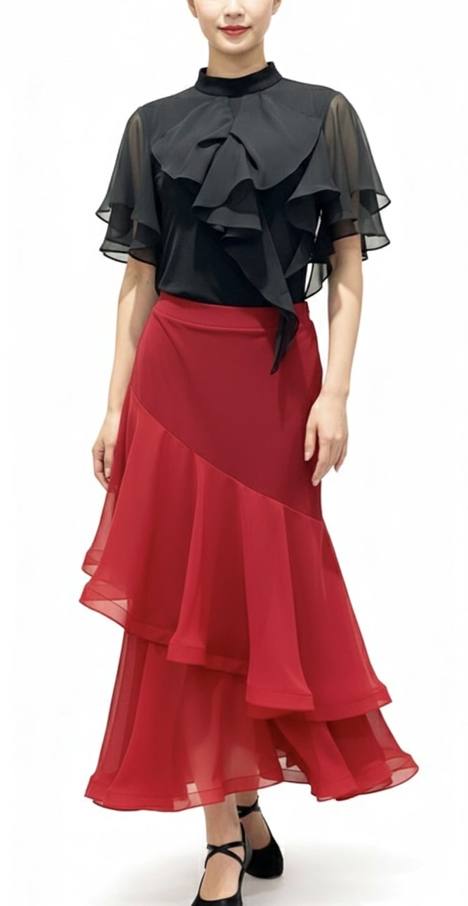 【POPCONATELIER】から新作登場! 2段フリルジのョーゼットスカートです♪ 斜めに配置されたフリルがアシンメトリー効果とあいまって、リズム感あふれる足の動きに更なる躍動感を生むことでしょう。