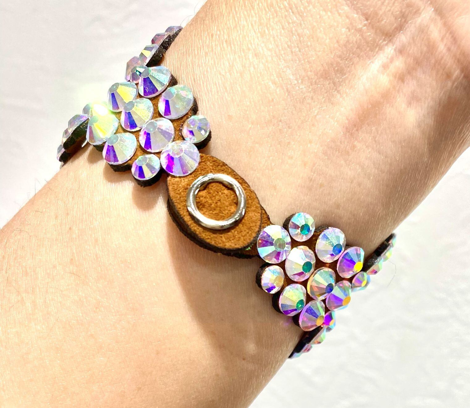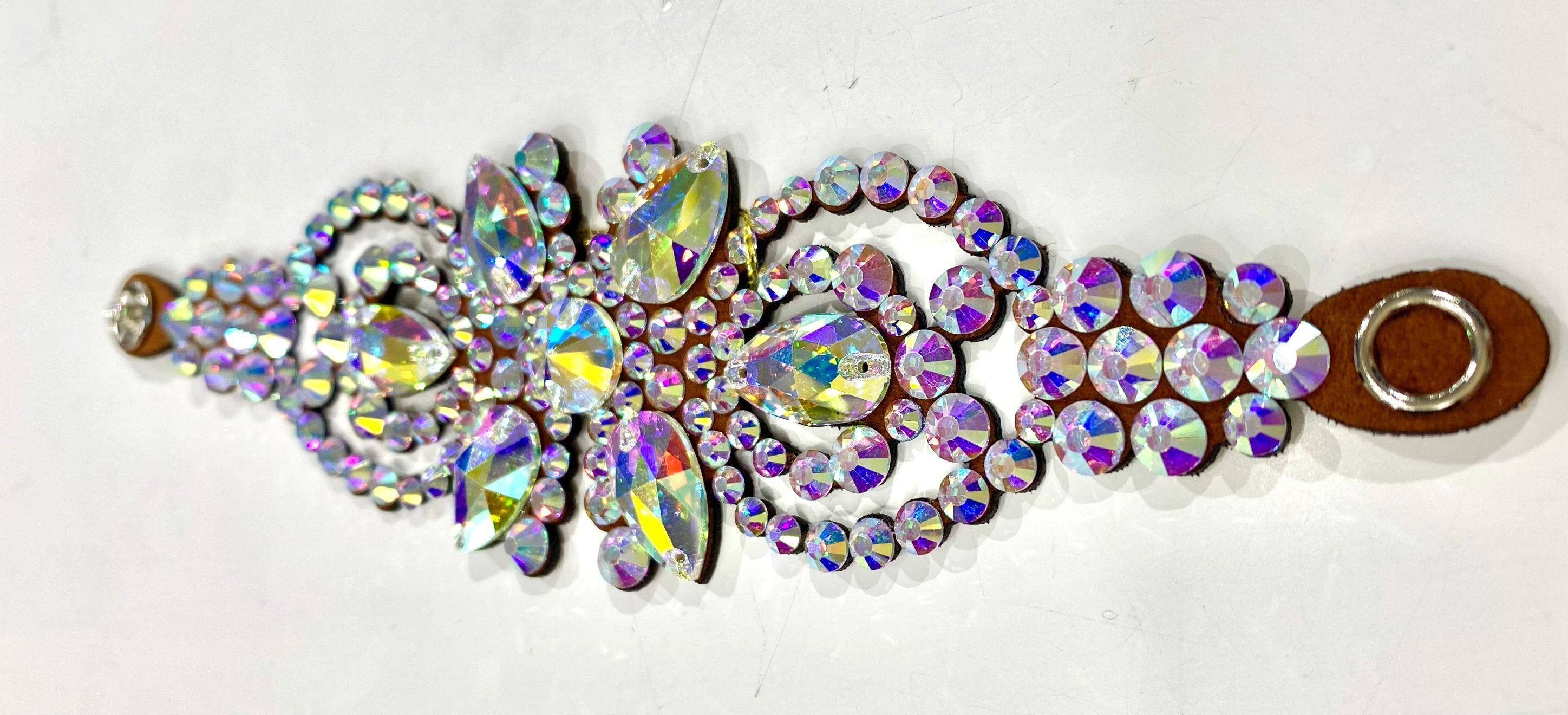 合皮を型抜いてクリスタルを並べた、計算しつくされたデザインが【POPCON ATELIER】の個性的な1点。大粒のスワロを囲む大小のストーンが、あらゆる角度から見ても煌めく洗練されたフォルムとなっております!