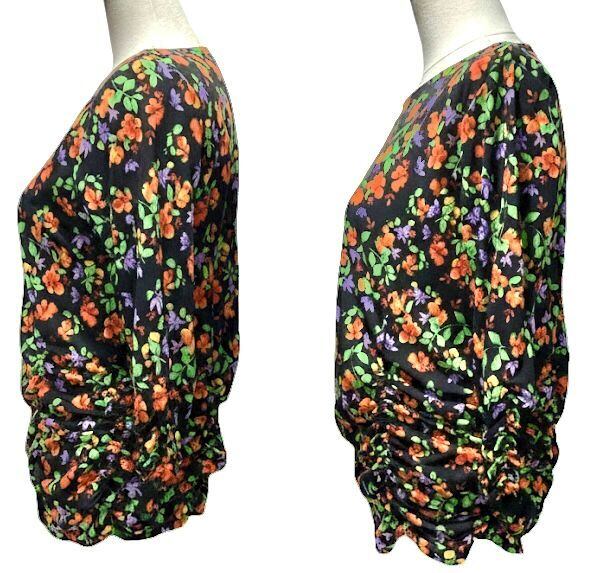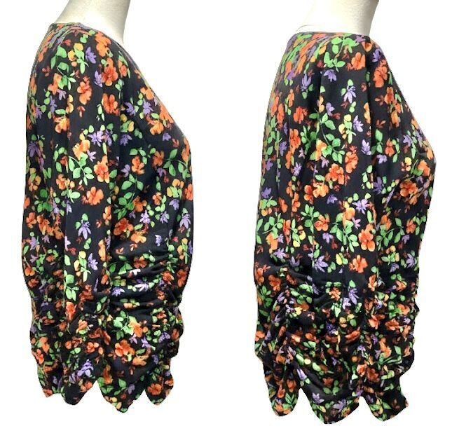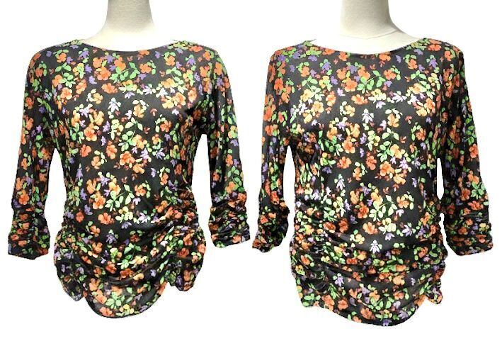七分袖に3本の伸縮性のあるシャーリングがあるため、腕まくり次第では五分袖にもなるデザイン性のある一着♪ 腕を華奢見えにみせる効果がある上、前身頃の両サイドに2本、後ろ身頃にも同じく2本施した伸縮性のあるシャーリングに、生地をたっぷりと使用することで、気になるお腹周りをスッキリとした印象にします。裾のシャーリングによりドレープも綺麗です。
