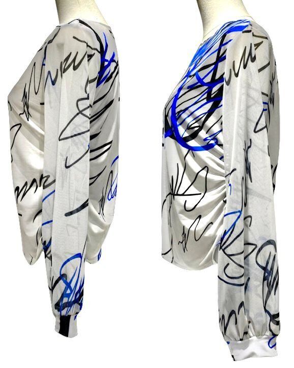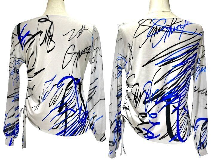 ストレッチレースの控えめなパフスリーブは、腕を華奢見えにみせる効果がある上、前身頃の片方だけに共布のリボンが通してあり、シャーリングが可能。絞る事でアクセントとなり、気になるお腹周りをスッキリとした印象にします。生地のモチーフはペイント柄で、1点1点柄の出方が異なるのもおしゃれです!